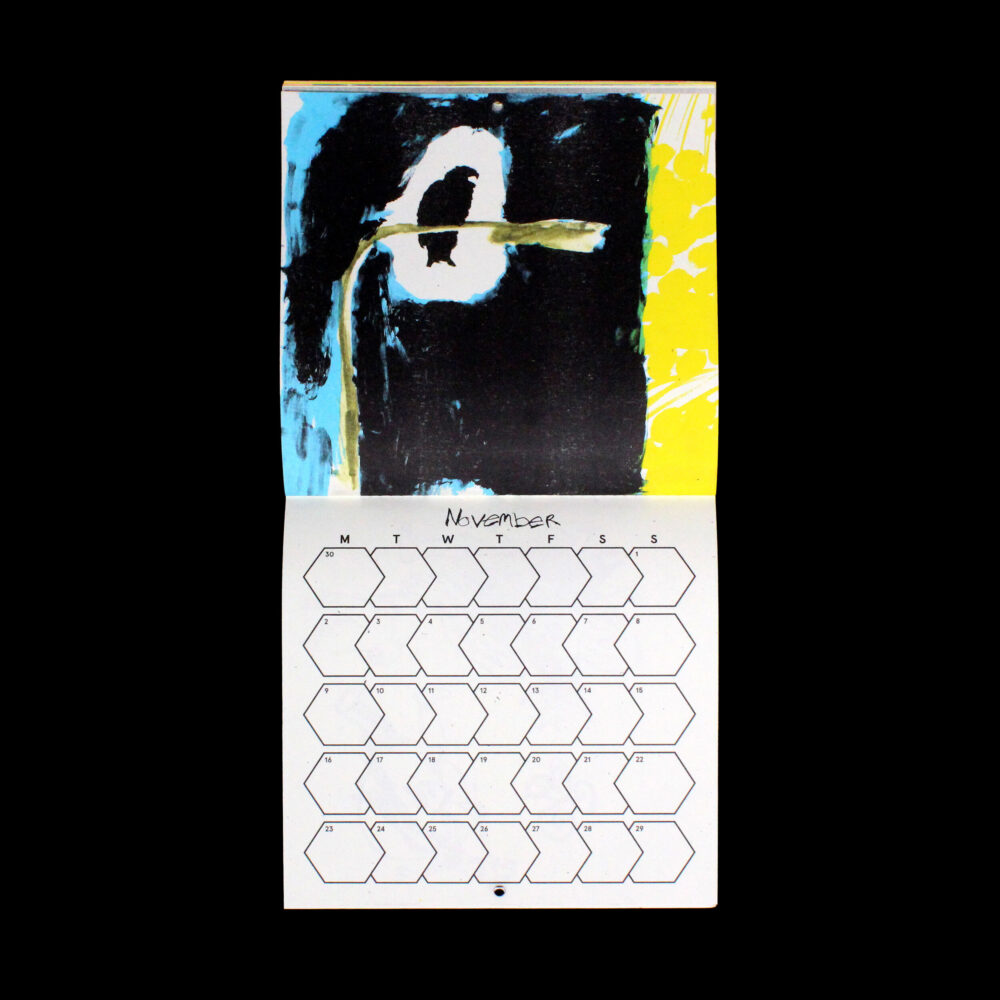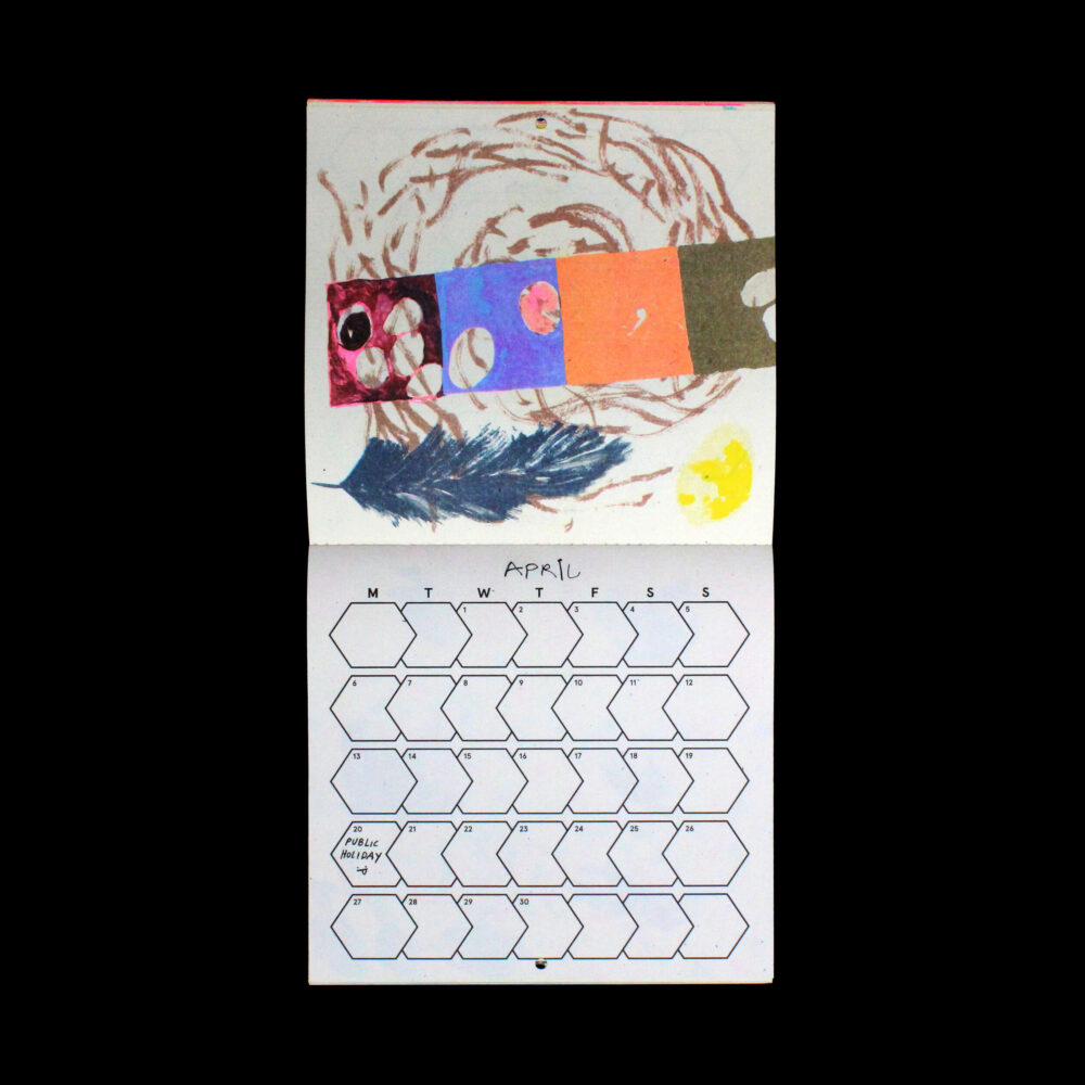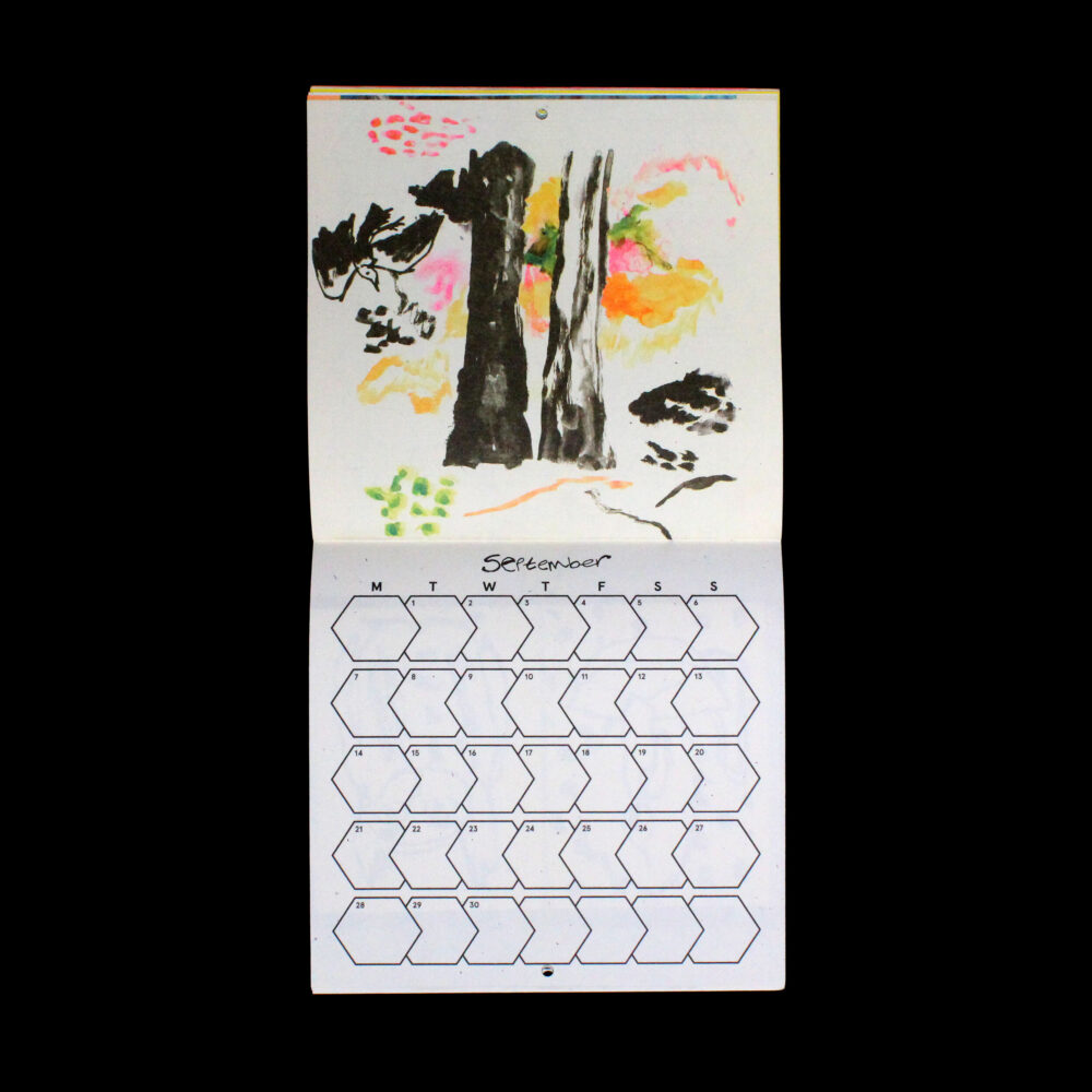 The calendar includes 12 purpose-made and beautiful artworks, Riso printed in Aqua, Yellow, Black and Fluorescent Pink inks onto 100% recycled Cairn Straw Cream 130gsm with 250gsm cover