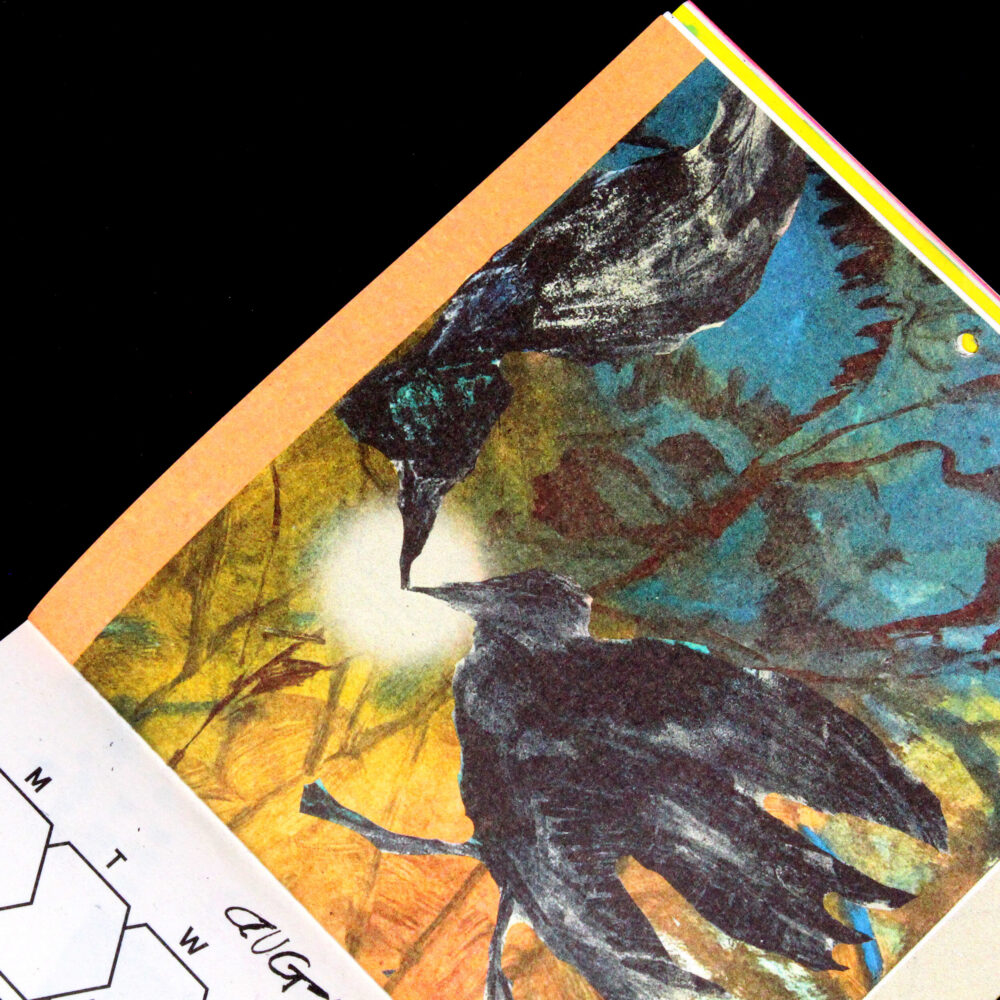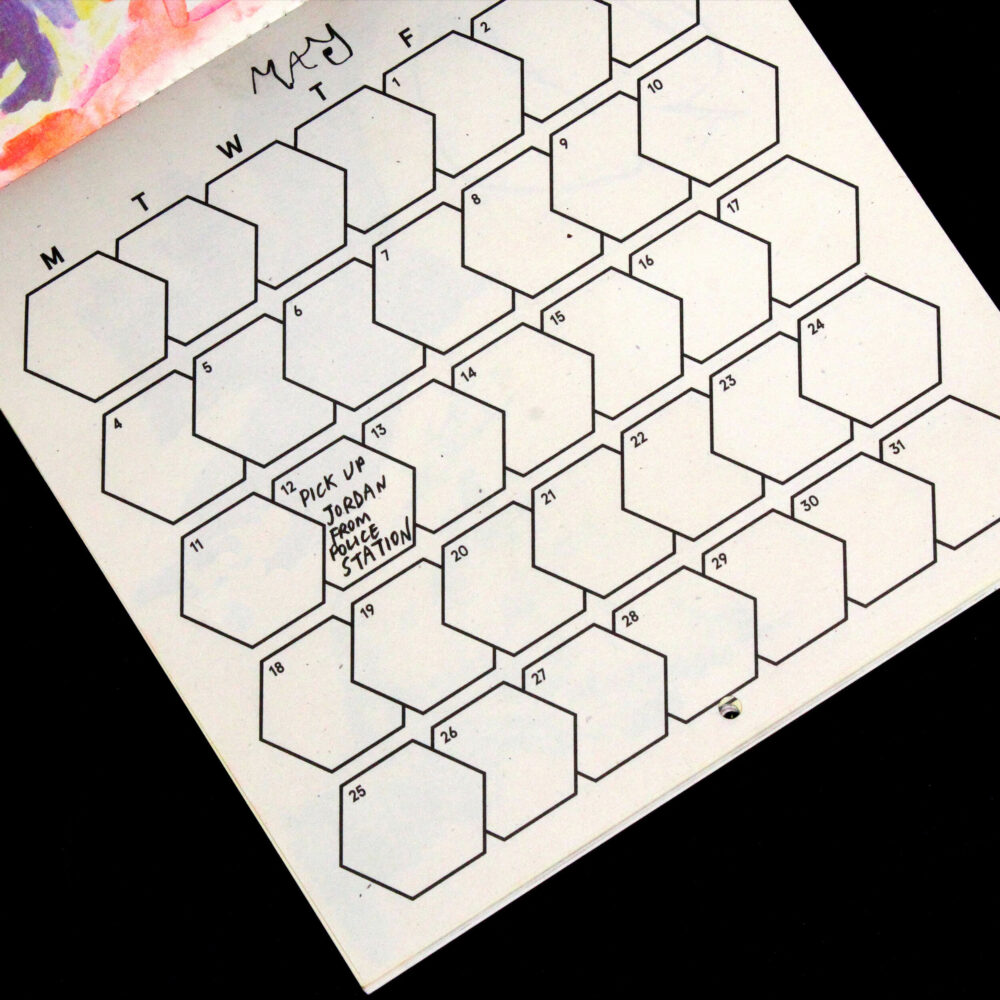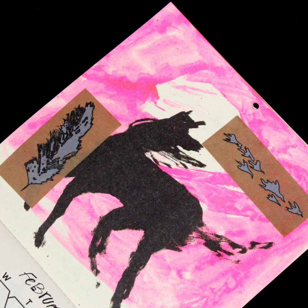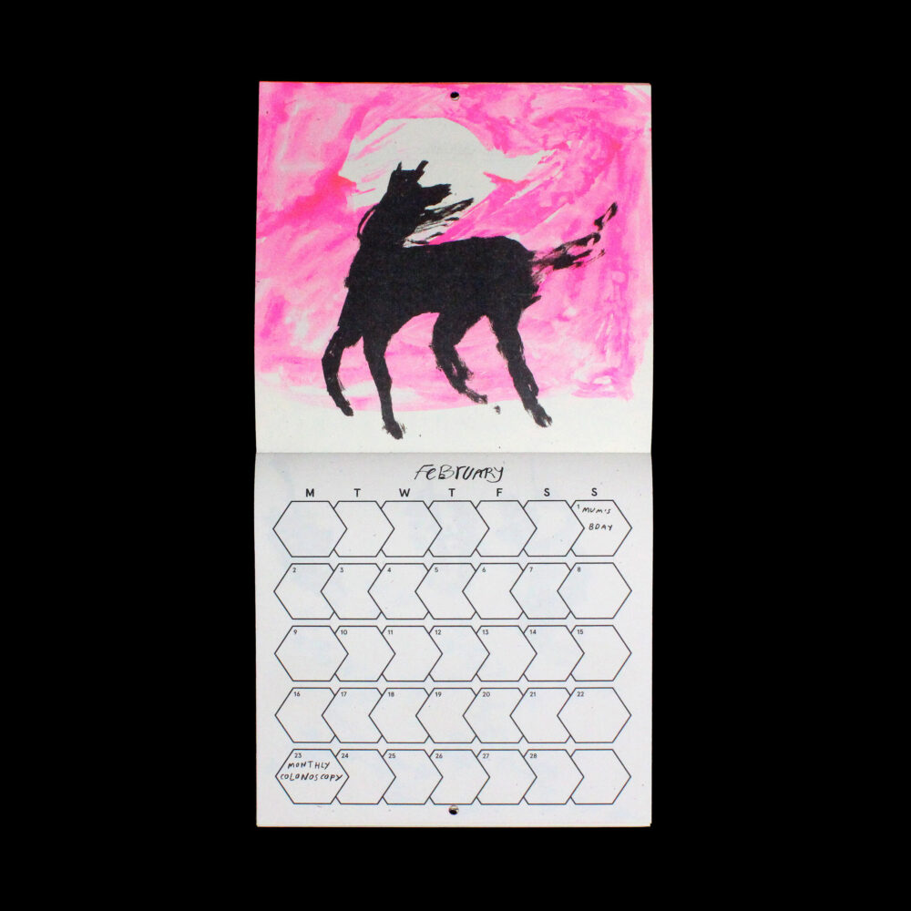 The calendar includes 12 purpose-made and beautiful artworks, Riso printed in Aqua, Yellow, Black and Fluorescent Pink inks onto 100% recycled Cairn Straw Cream 130gsm with 250gsm cover